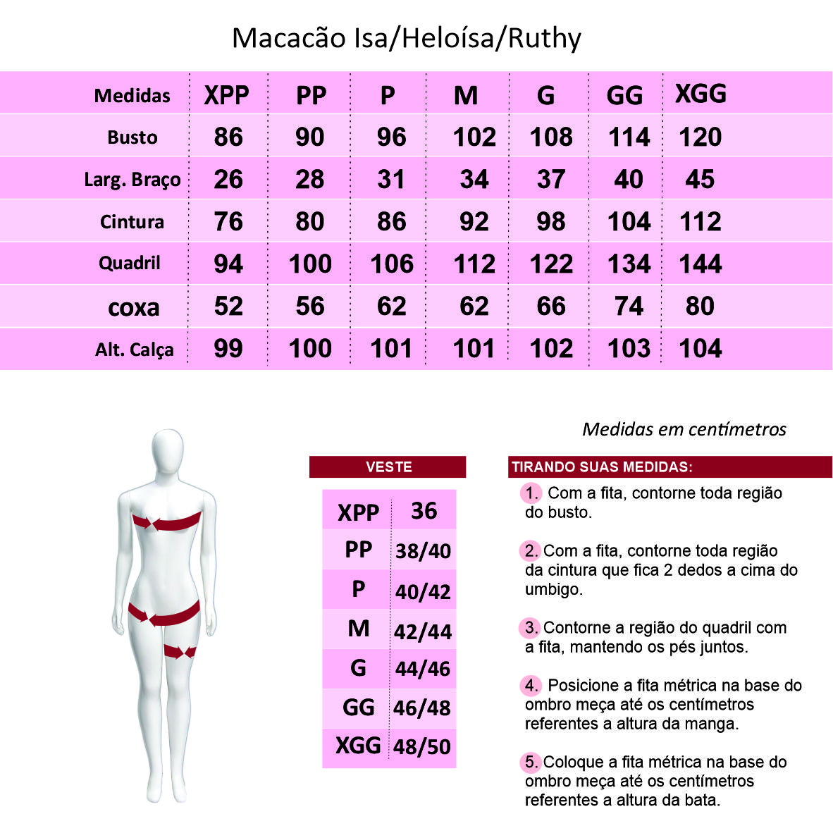 O modelo foi desenvolvido com dois bolsos superiores embutidos fakes, manga curta, dois bolsos na calça, calça com tornozelo com botões e zíper frontal metálico na parte da blusa. NÃO POSSUI FAIXA DE AMARRAÇÃO.