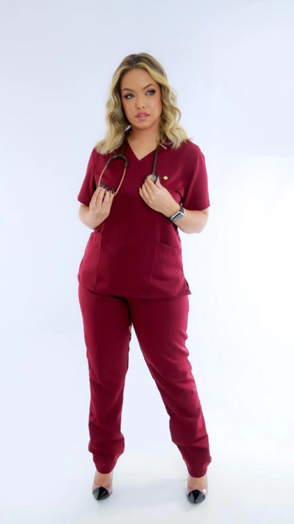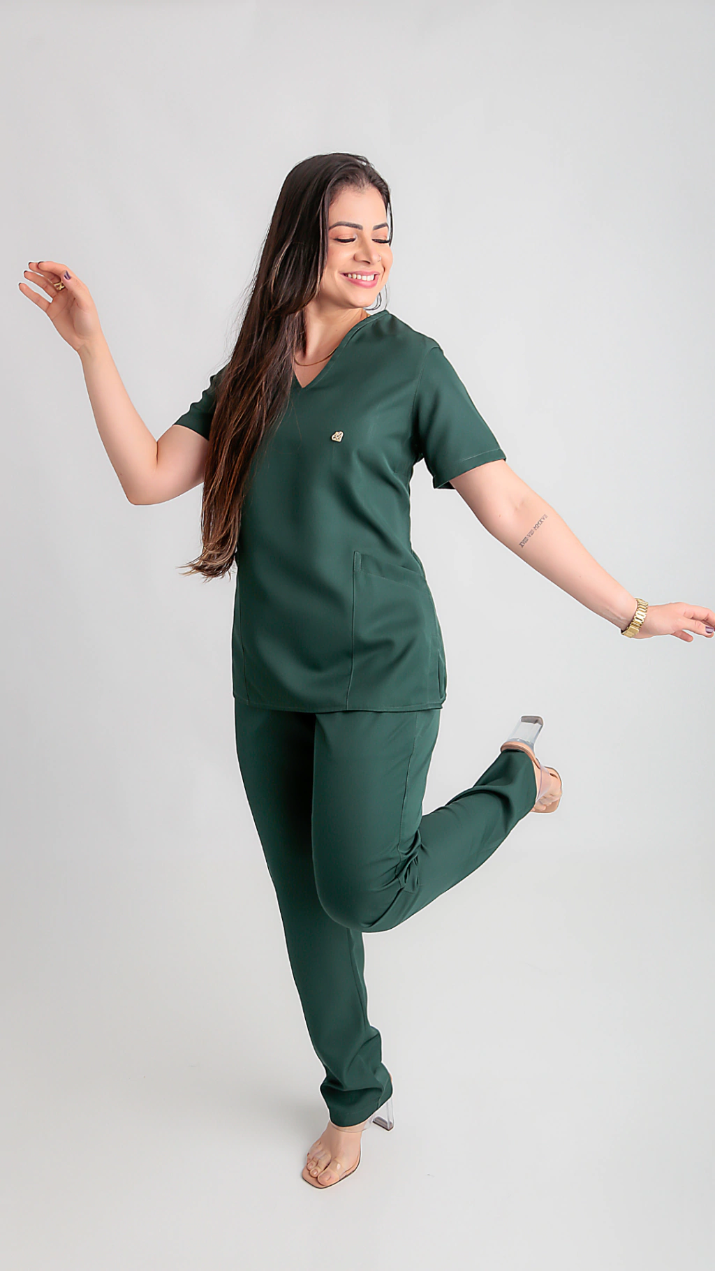 Confeccionado em Gabardine premium importado (100% poliéster) esse produto possui modelagem mais soltinha. A blusa do scrub é confeccionada em gola V, manga simples e dois bolsos frontais utilitários aliados das suas atividades diárias. A Calça possui elástico na cintura e dois bolsos frontais.