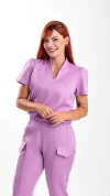 O scrub Pandora é confeccionado em tecido Two way com 5% de elastano. A blusa do modelo possui as mangas levemente bufantes, gola em V com detalhe em estrela, modelagem acinturada e fenda na parte das costas para não amarrar no quadril. A calça do conjunto é jogger, com recorte e 2 bolsos frontais, além a cintura meio elástico.