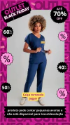 O scrub básico é confeccionado em oxfordine. O conjunto possui gola V, 4 bolsos, cintura de elástico e tornozelo jogger.